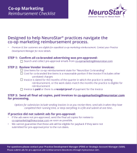 Co-op Marketing is designed to help you build patient awareness of NeuroStar and improve patients’ access to care. The Keys to Co-op are designed to identify the most impactful programs and marketing tactics with proven assets, and preferred vendors so you can get the most out of your marketing. Your PDM can help you with detailed guidance for how Co-op will most specifically benefit your practice.